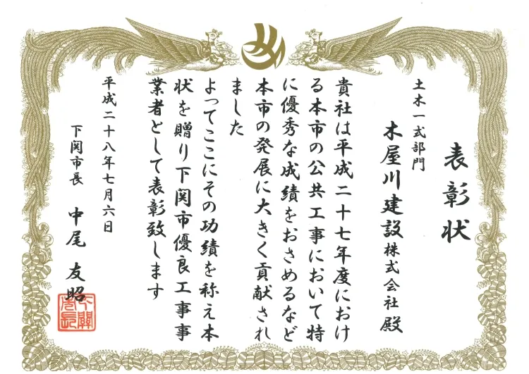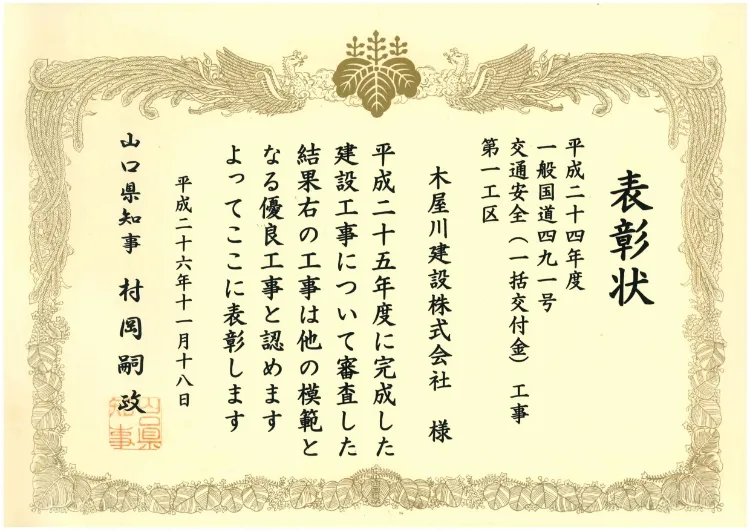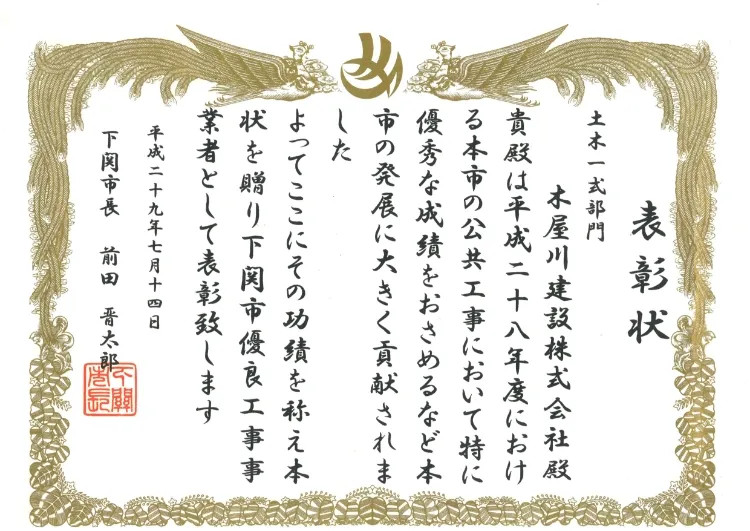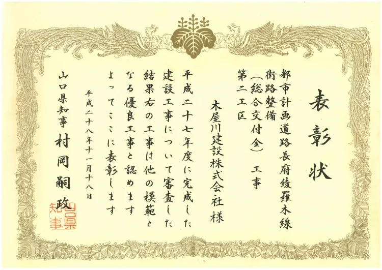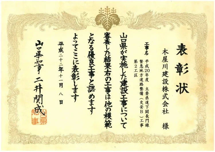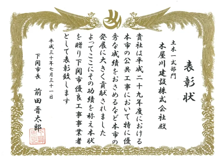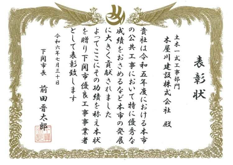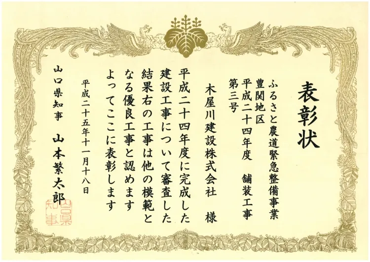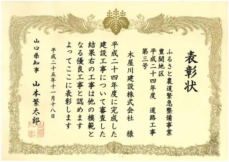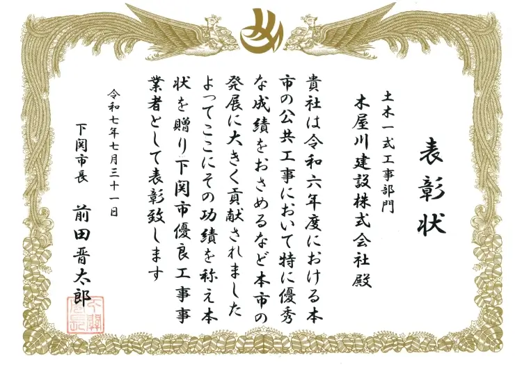 木屋川建設は昭和52年の創業以来、山口県下関市を拠点に舗装工事・土木工事・水道施設工事を中心に施工を行っています。公共道路や橋の補修、自然災害による被害への復旧対応など、地域の暮らしを支える工事に携わってまいりました。