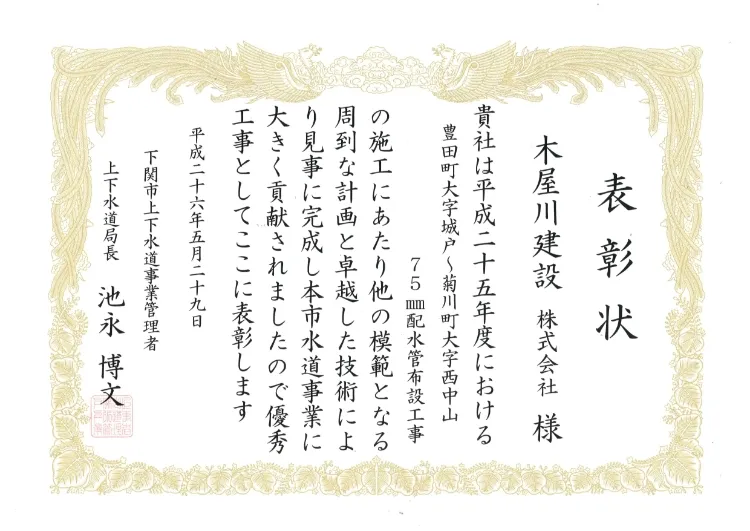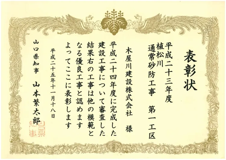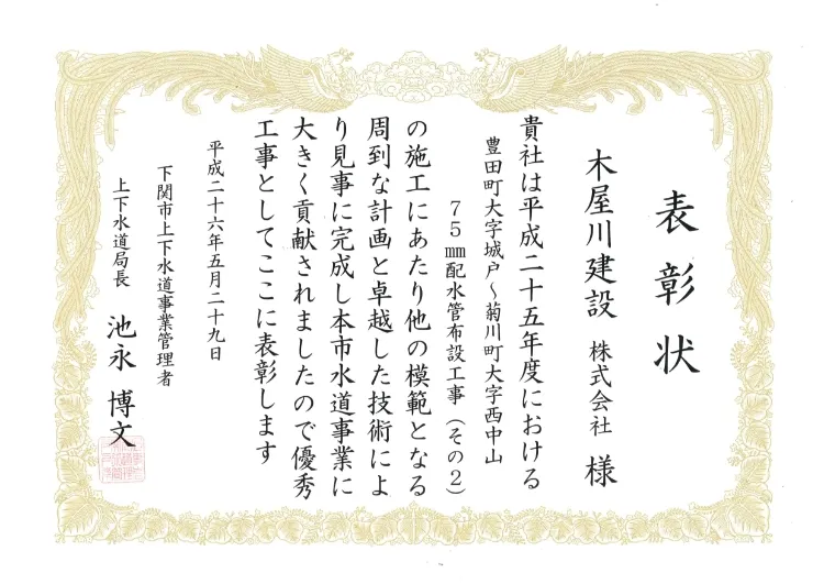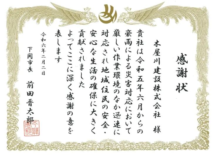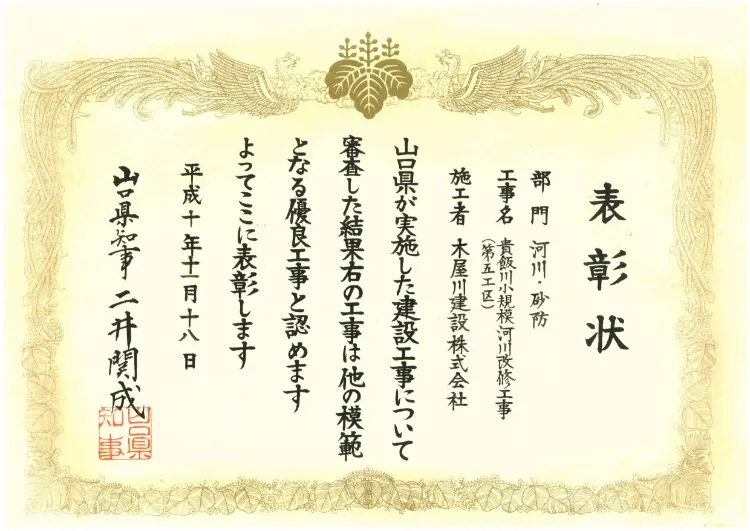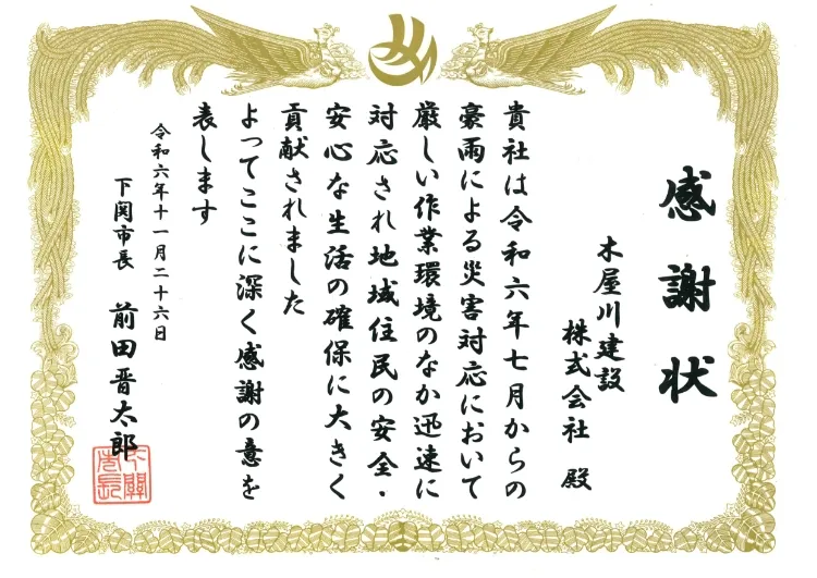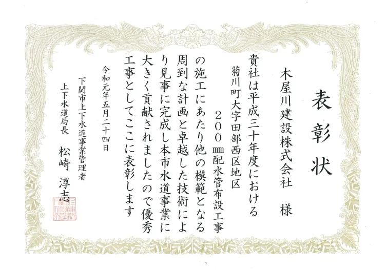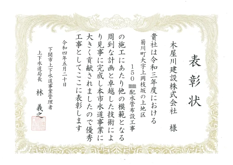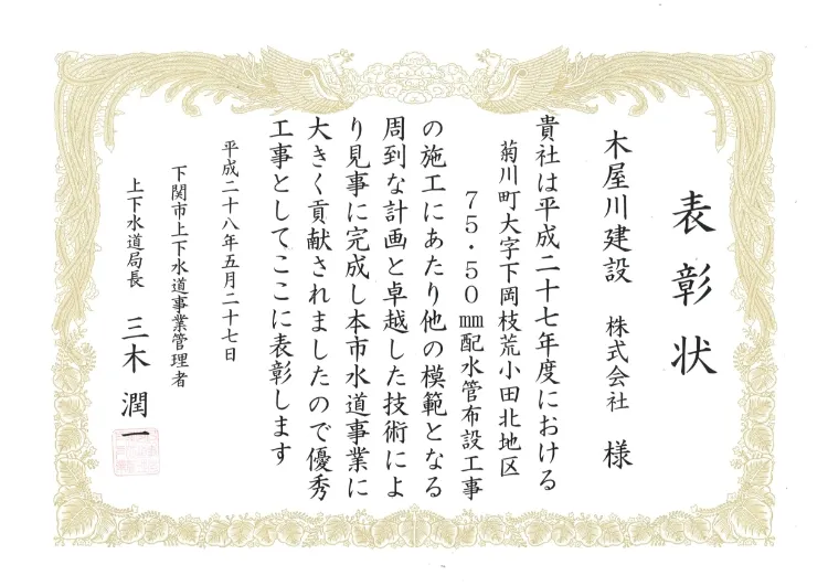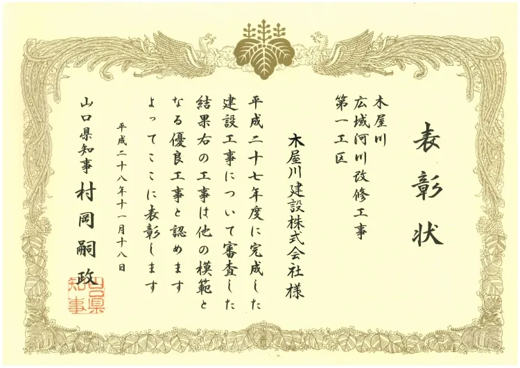 木屋川建設は昭和52年の創業以来、山口県下関市を拠点に舗装工事・土木工事・水道施設工事を中心に施工を行っています。公共道路や橋の補修、自然災害による被害への復旧対応など、地域の暮らしを支える工事に携わってまいりました。